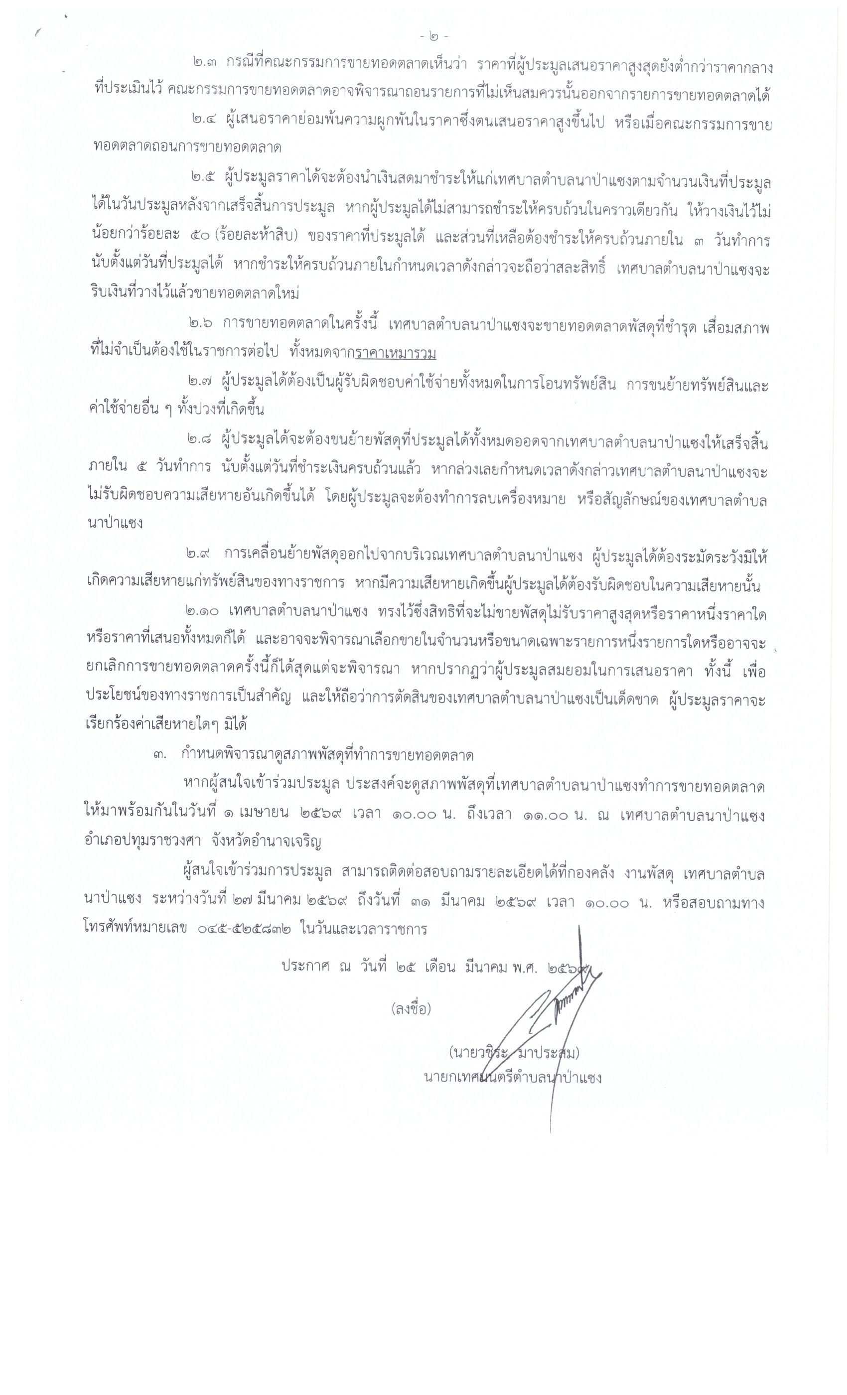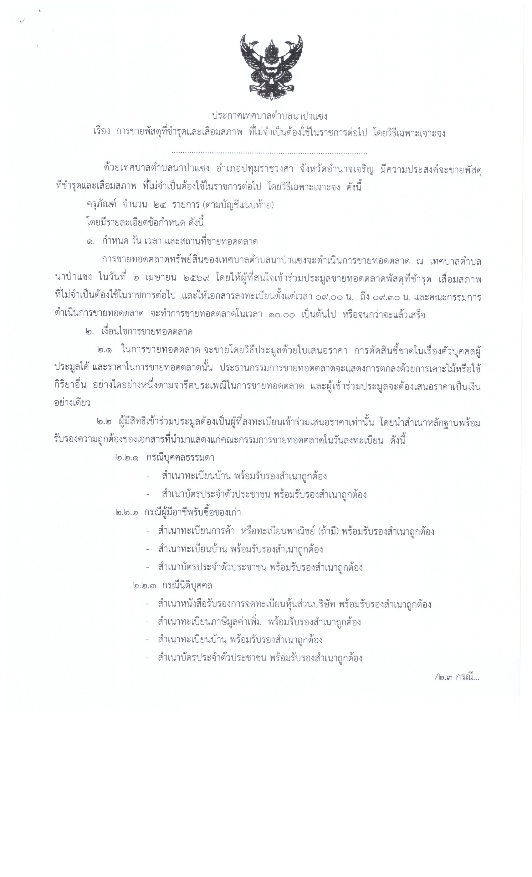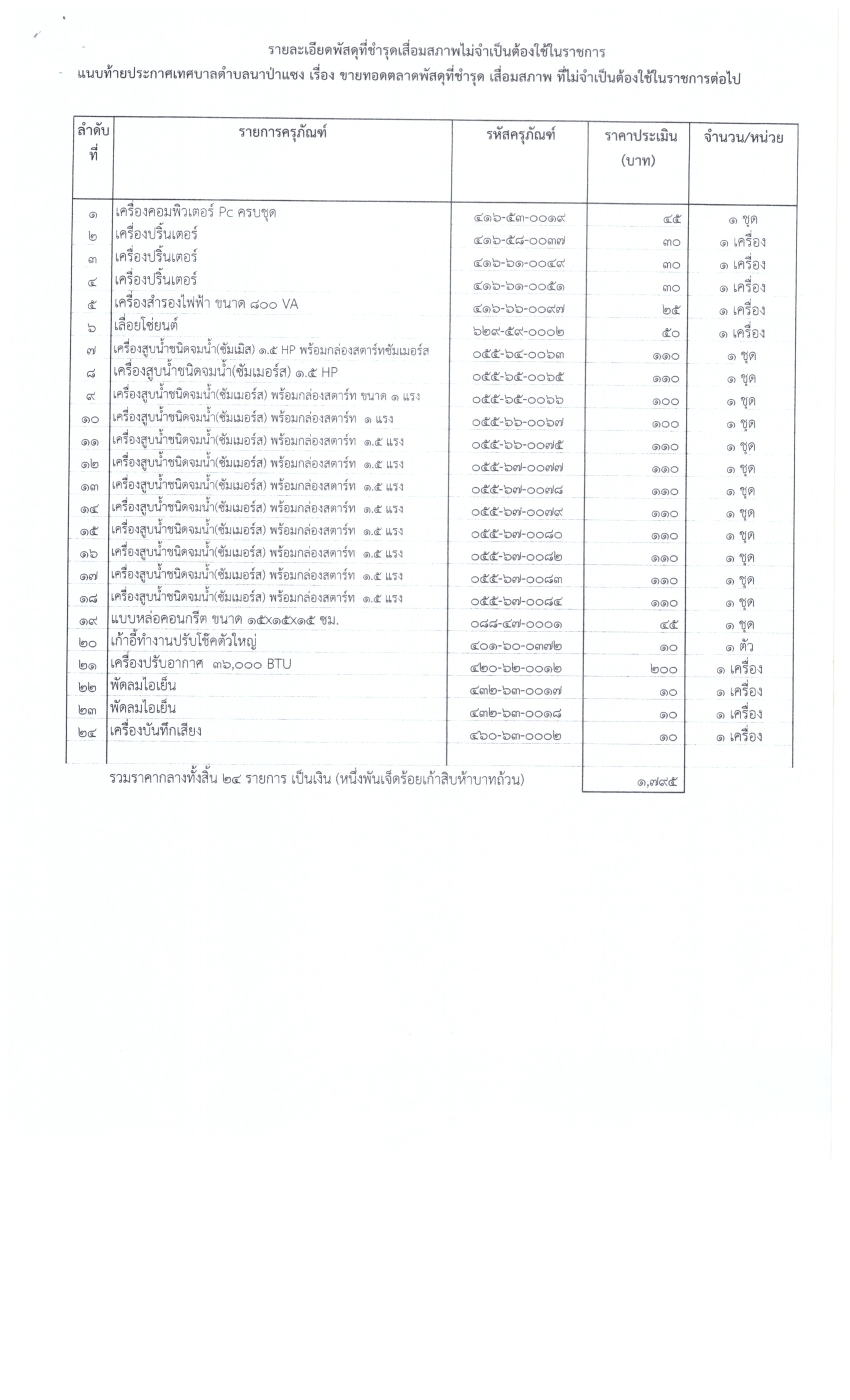 ประกาศ ขายทอดตลาดพัสดุ-ครุภัณฑ์ ชำรุดเสื่อมสภาพ จำนวน 24 รายการ(ทต.นาป่าแซง)