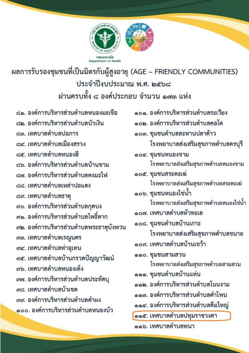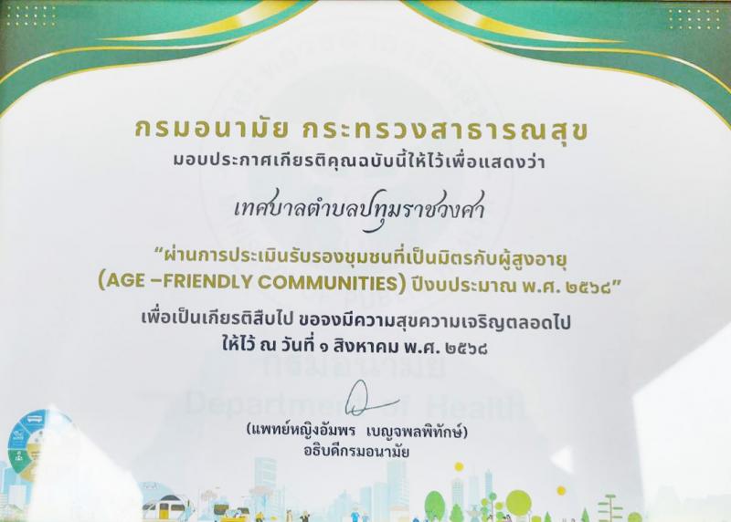 รายละเอียด : นายธรรมศาสตร์ โพธิ นายกเทศมนตรีเทศบาลตำบลปทุมราชวงศา นำพนักงาน ทำกิจกรรมเชิดชูรางวัลผ่านการรับรองชุมชนที่เป็นมิตรกับผู้สูงอายุ (AGE-FRIENDLY COMMUNITIES) ประจำปีงบประมาณ 2568 โดยผ่านครบทั้ง 8 องค์ประกอบ ผลการรับรองชุมชนที่เป็นมิตรกับผู้สูงอายุคือชุมชนที่ได้ดำเนินงานปรับปรุงสภาพแวดล้อม โครงสร้างพื้นฐาน และบริการต่างๆ ให้เหมาะสมและเอื้อต่อการมีคุณภาพชีวิตที่ดีของผู้สูงอายุ ทำให้ผู้สูงอายุสามารถมีสุขภาพดี เข้าร่วมกิจกรรมทางสังคมได้อย่างมีส่วนร่วม และเข้าถึงบริการสุขภาพได้อย่างทั่วถึง โดยมีเป้าหมายเพื่อส่งเสริมการมีอายุยืนยาวและคุณภาพชีวิตที่ดีในสังคมสูงวัย