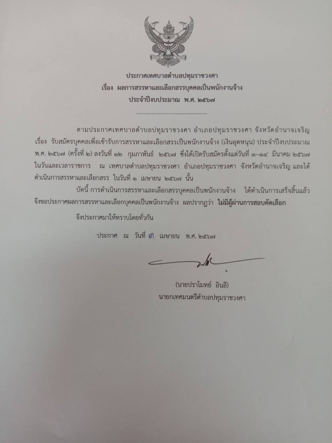 ประกาศผลการสรรหาและเลือกสรรบุคคลเป็นพนักงานจ้าง ประจำปีงบประมาณ 2567