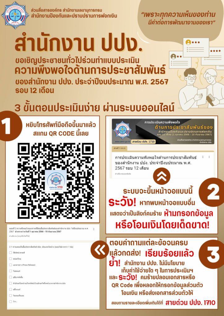 เชิญชวนประชาชนร่วมประเมินความพึงพอใจด้านการประชาสัมพันธ์ของสำนักงาน ปปง. ประจำปีงบประมาณ พ.ศ. 2567 รอบ 12 เดือน