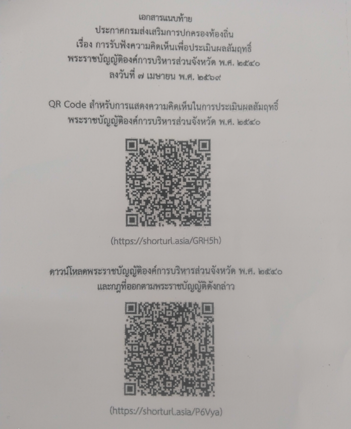 ขอเชิญร่วมแสดงความคิดเห็นผ่าน QR Code เพื่อประเมินผลสัมฤทธิ์ พ.ร.บ.องค์การบริหารส่วนจังหวัด พ.ศ.2540